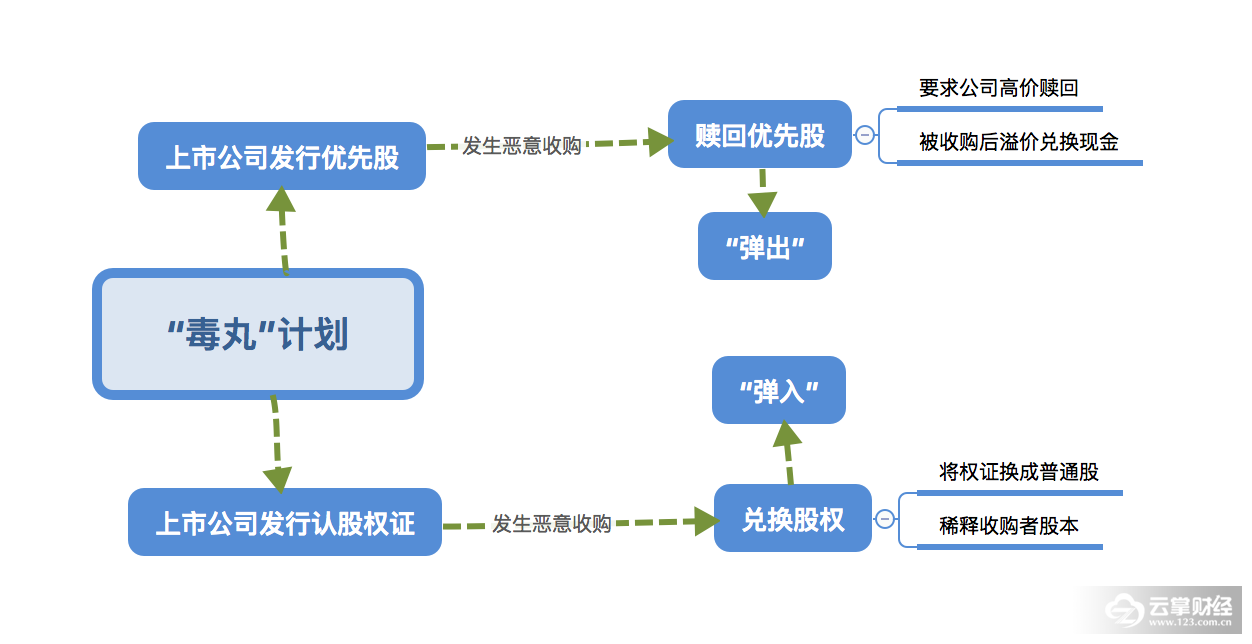 “毒丸计划”一般分为“弹入”和“弹出”,弹出计划通常指履行购股权、购买优先股。弹入一般是指以很高的溢价购回其发行的购股权。