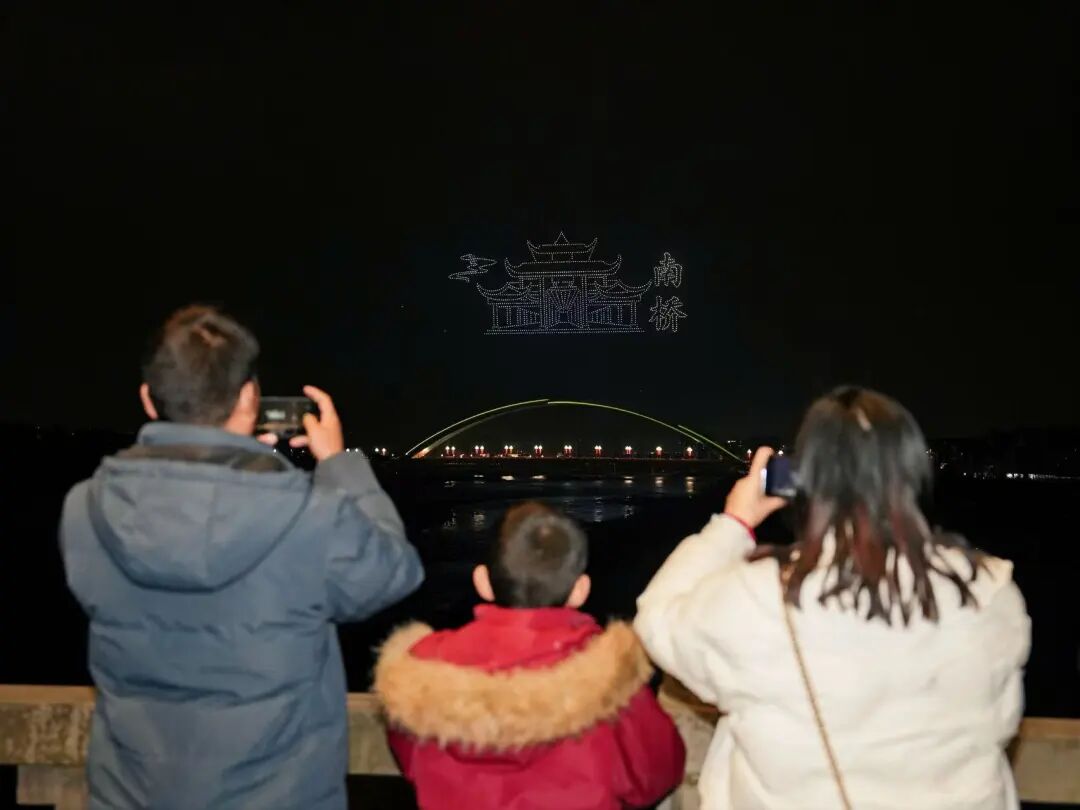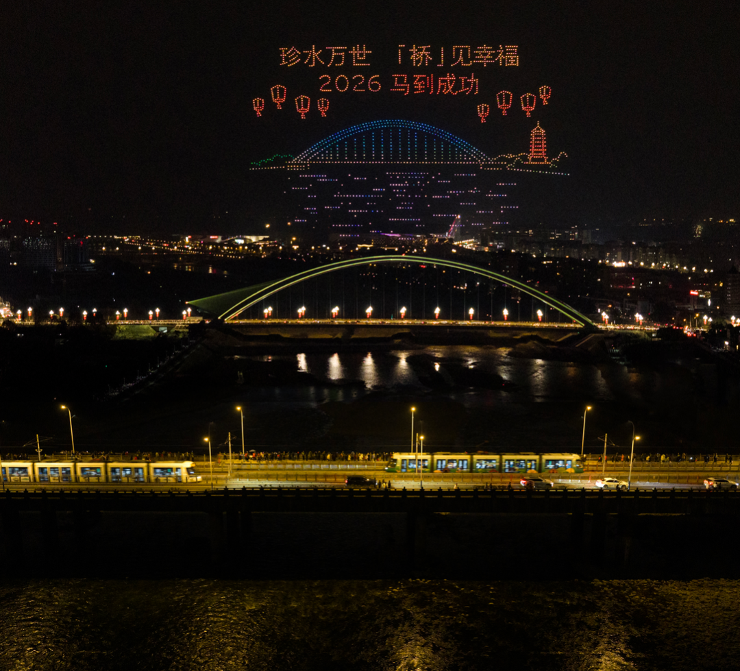 大年初一晚,岷江之畔灯火渐起,青城大桥上空,一场融合千年水利智慧与现代光影艺术的无人机秀如约而至。由都投集团主办的“珍水万世・‘桥’见幸福”都江堰主题光影秀璀璨启幕,以无人机天幕秀与桥梁光影相结合的形式,为市民与游客带来一场融合历史、科技与艺术的新春视觉盛宴,现场携家带口的观众络绎不绝,惊叹与欢呼此起彼伏。