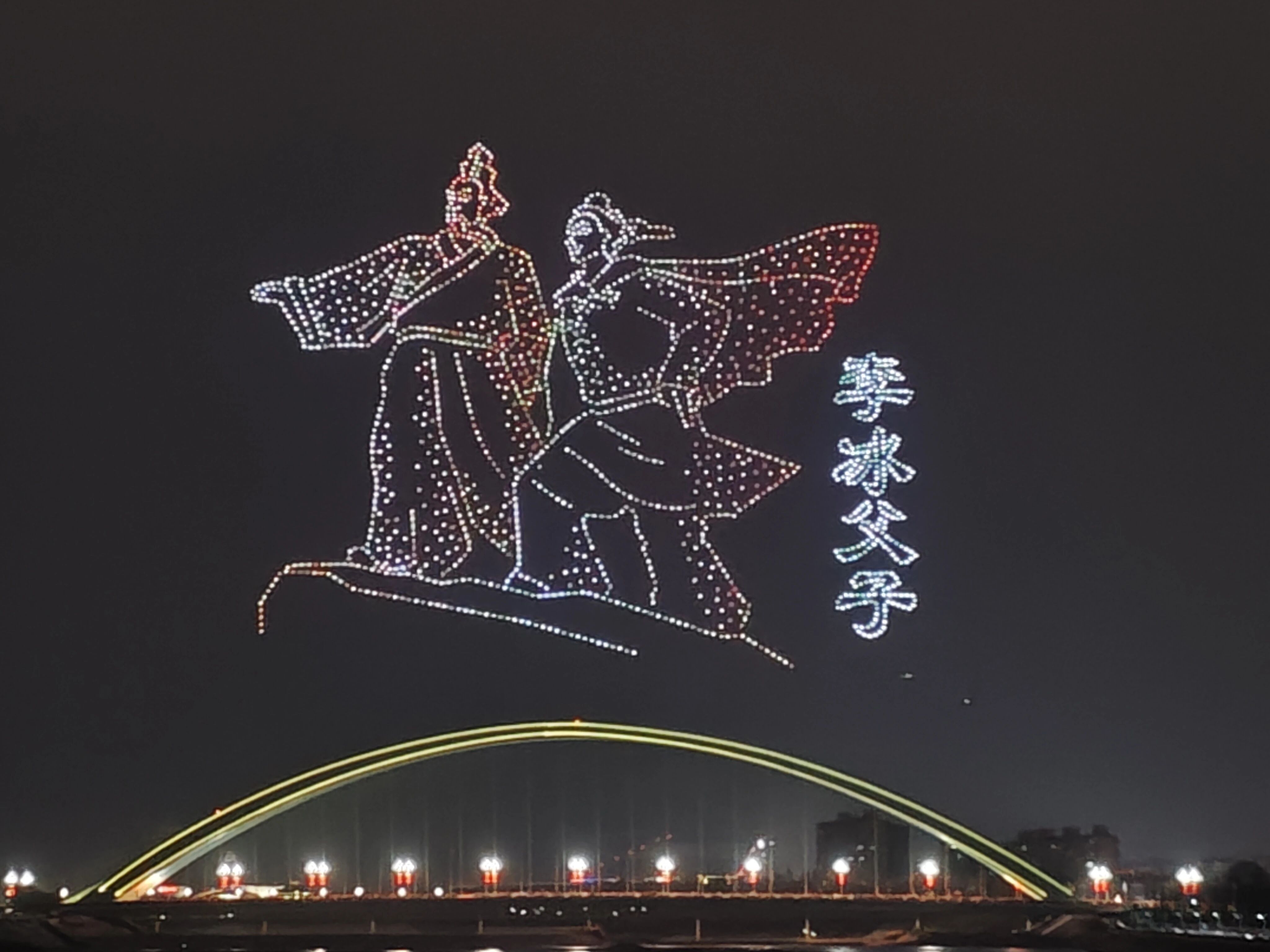晚7点半,伴随悠远古乐,千余架无人机腾空而起,起幕的光影如凤凰展翅般灵动磅礴,瞬间攫住全场目光,以天为幕、以光为笔,围绕“珍水万世・‘桥’见幸福”主题,徐徐展开一幅致敬都江堰传奇、礼赞幸福生活的璀璨画卷。