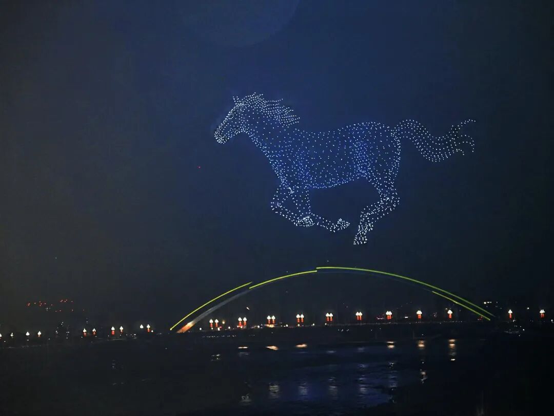 本次无人机秀持续约12分钟,共分为“天马迎宾・国际会客厅”“神马护城・珍水万世堰”“骏马奔腾・幸福安逸城”三个篇章,全景呈现都江堰作为世界水利奇迹、国际交往窗口、宜居幸福之城和天府粮仓重要承载地的多重角色。