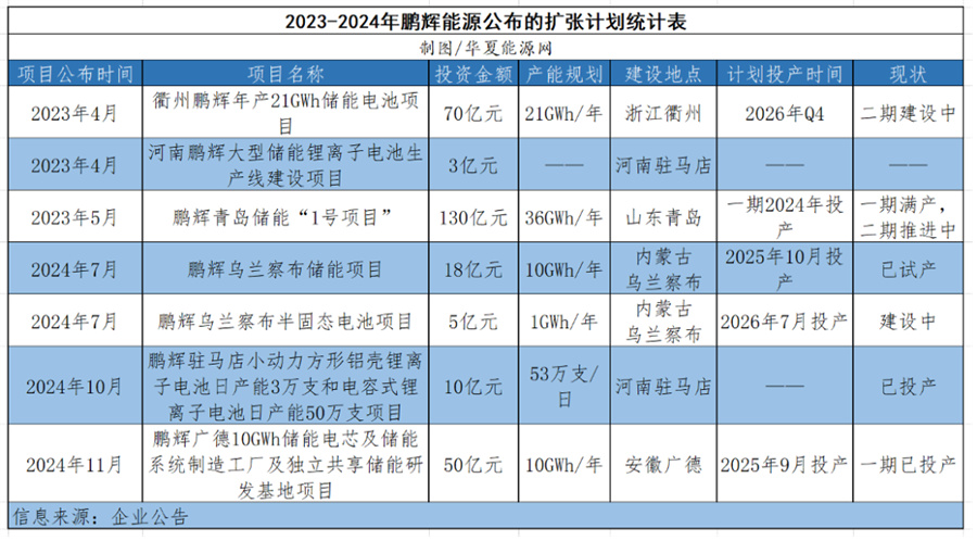 华夏能源网不完全统计,仅2023年至2024年,鹏辉能源对外公布了7个扩产项目,涉及储能电池、半固态电池、小动力方形铝壳锂电以及电容式锂电等,投资总规模合计271亿元。而截至2025年三季度末,鹏辉能源的总资产也不过203亿元。