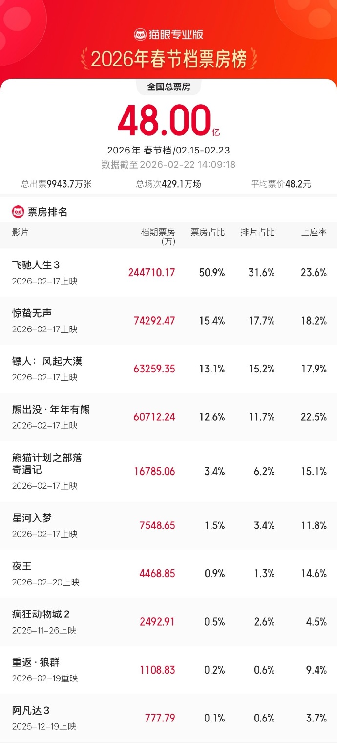 2月22日,据猫眼专业版数据,2026年春节档档期总票房(含预售)破48亿,《飞驰人生3》《惊蛰无声》《镖人:风起大漠》分列前三位。