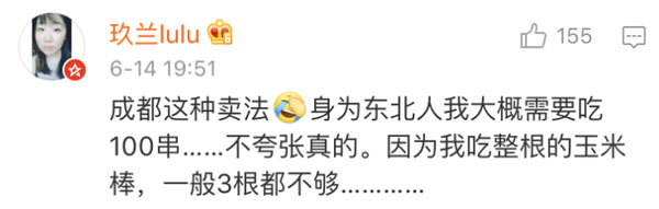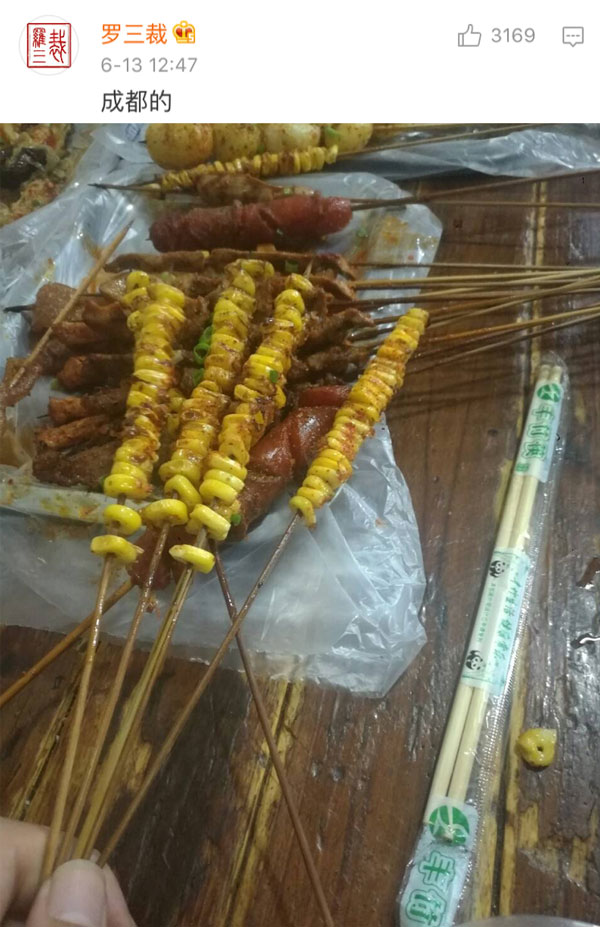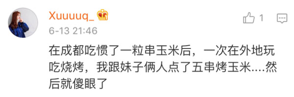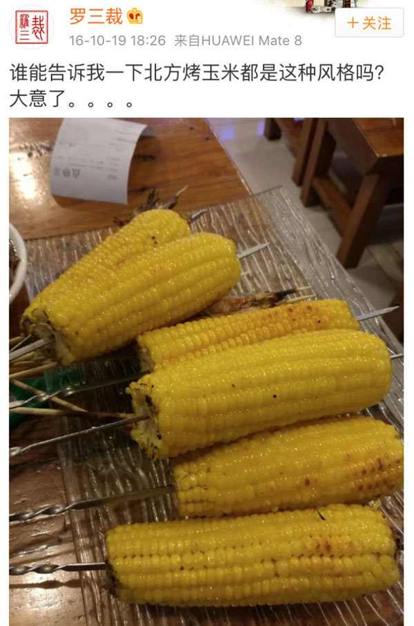 事情是这样的,来自成都的网友@罗三裁,去年在天津撸串的时候,按照自己在成都的习惯,点了6根烤玉米。