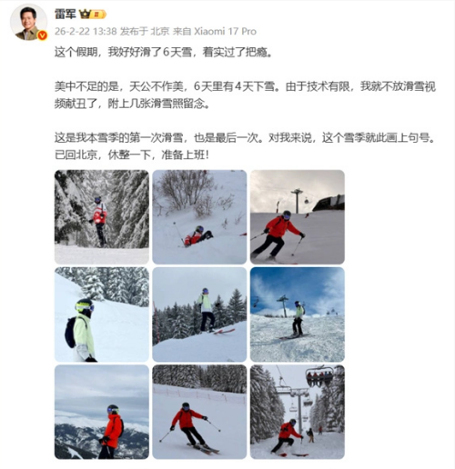 春节假期接近尾声,今天小米掌门人雷军在社交平台上透露,这个假期好好滑了6天雪,着实过了把瘾,只不过天公不作美,6天里有4天下雪。“这是我本雪季的第一次滑雪,也是最后一次。”由此可见,这位科技圈大忙人十分享受惬意的滑雪时光,过年身心得到彻底放松。