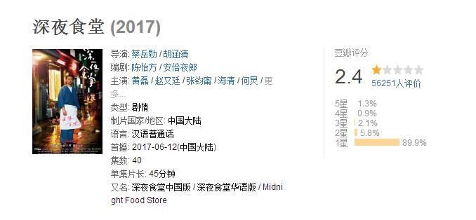 低于电视剧版《幻城》的3分,低于《富春山居图》的2.9分——黄磊版的《深夜食堂》以能够买中超级大乐透的手气,收获豆瓣2.4超低评分,可以说烂出了华语片的新境界。