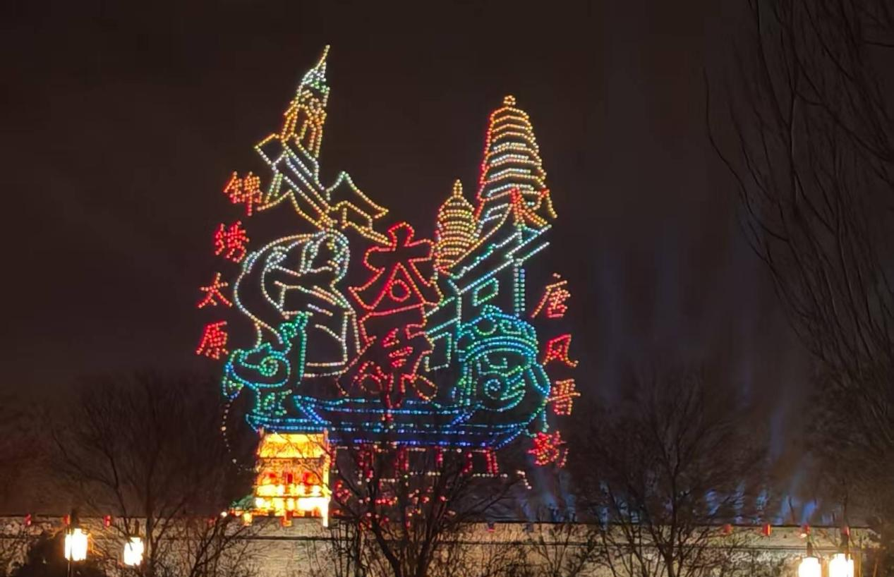 人气爆棚的背后,离不开古县城打造的一系列新春特色活动和惠民举措。马年春节期间,太原古县城打造了欢乐中国年·古城奇遇记——2026年太原古县城福马迎春嘉年华活动,构筑七大主题体验区。其中,夜晚的古县城上空,3000架无人机以天为幕,通过变化方位,演绎出太原双塔寺、黑神话悟空等动态景象,吸引了众多游客驻足拍摄。