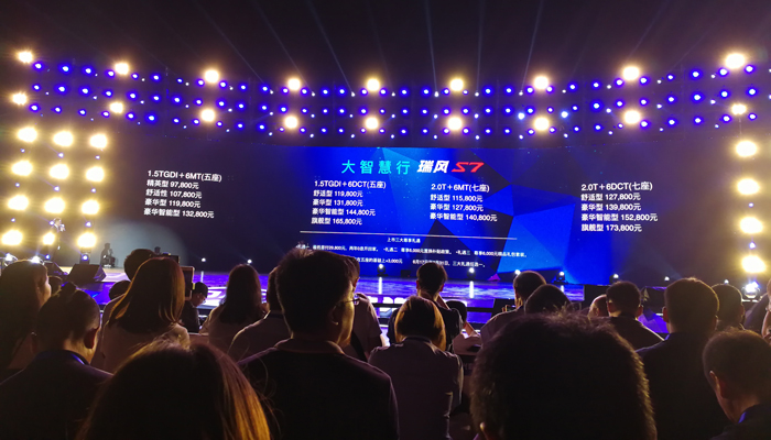 事实上,在瑞风S3之后,江淮汽车急需一辆能够使品牌向上的期间车型出现,此次上市的瑞风S7就应运而生。瑞风S7由江淮日本设计中心主导,意大利设计中心及江淮本部联合设计,前脸采用了家族式设计;长宽高尺寸为4790/1900/1760mm,轴距为2750mm,外部配置方面整体较为丰富,即便是入门级的舒适型也标配了LED日间行车灯、电动外后视镜加热、自动大灯等配置,而豪华智能型则拥有后排侧隐私玻璃以及后视镜记忆+智能自调等配置;动力部分,瑞风S7将搭载1.5TGDI和2.0T+两款发动机,其中1.5TGDI发动机最大功率为128kW,峰值扭矩251N·m,2.0T+发动机最大功率为140kW,峰值扭矩为300N·m,匹配6速手动或6速双离合自动变速箱。