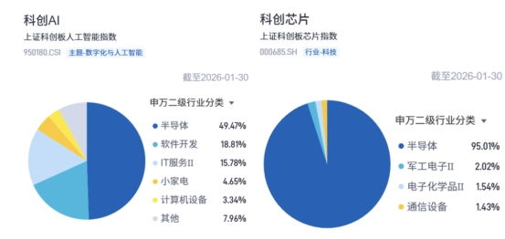 在科创板中,恰好有两只指数分别对应人工智能和芯片这两条赛道——上证科创板人工智能指数和上证科创板芯片指数。前者从科创板中选取30只业务涉及人工智能基础资源、技术及应用支持的上市公司,后者则覆盖半导体材料和设备、芯片设计、芯片制造、芯片封装和测试等芯片产业链各个环节的50家科创板公司。科创人工智能ETF易方达(588730)、科创芯片ETF易方达(589130)分别跟踪这两只指数,是布局相应领域的便捷工具。但对于普通投资者而言,应该如何选择?先把两只指数的具体特点看懂再说。