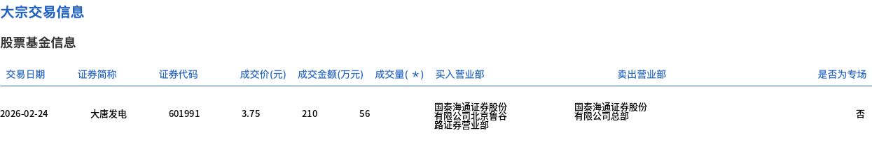 大唐发电今日大宗交易平价成交56万股,成交额210万元