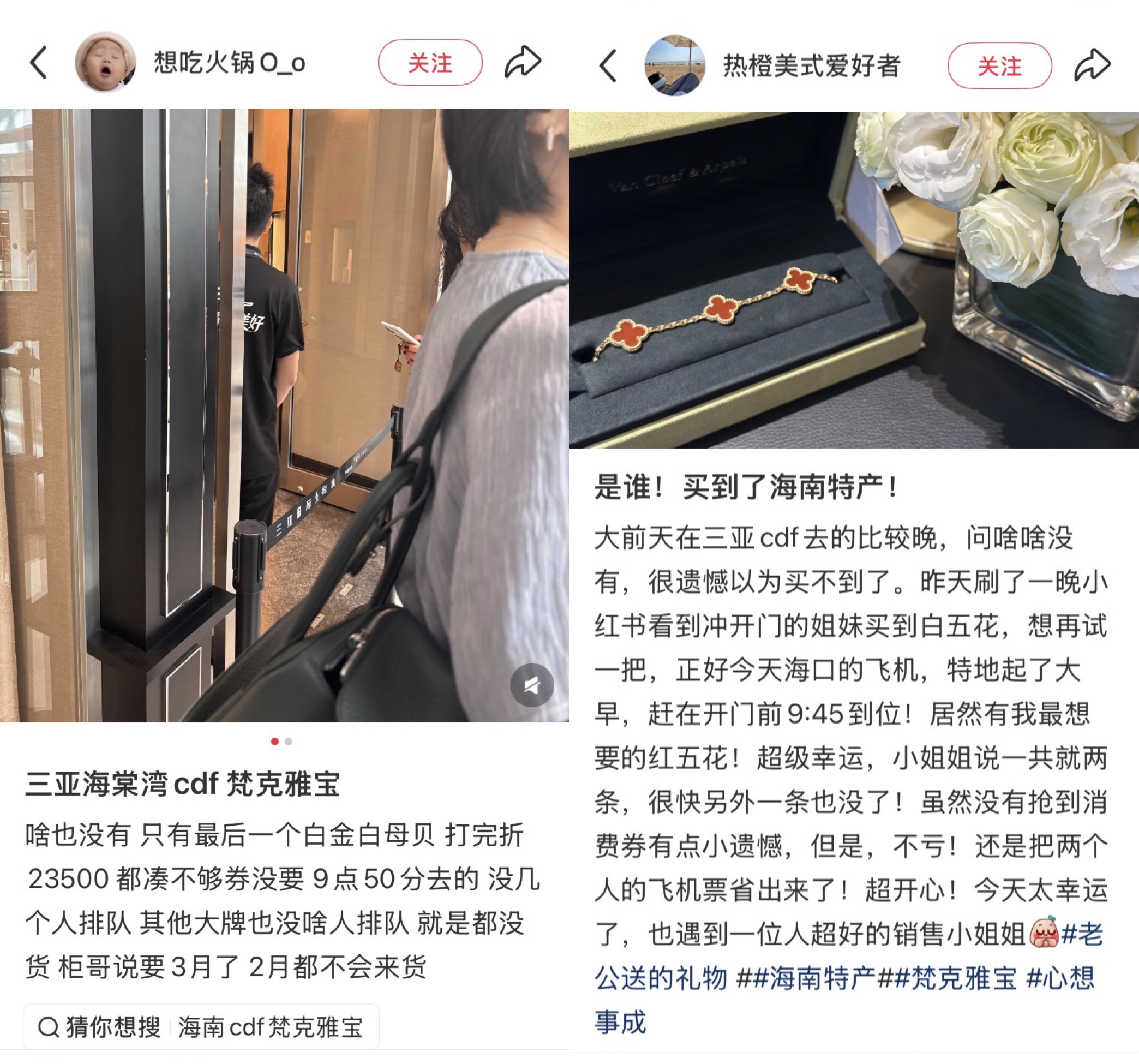 比起一些并不进免税店的奢侈品牌,如路易威登、迪奥等,梵克雅宝的价差优势明显,也因此在社交平台上被戏称为“海南特产”。