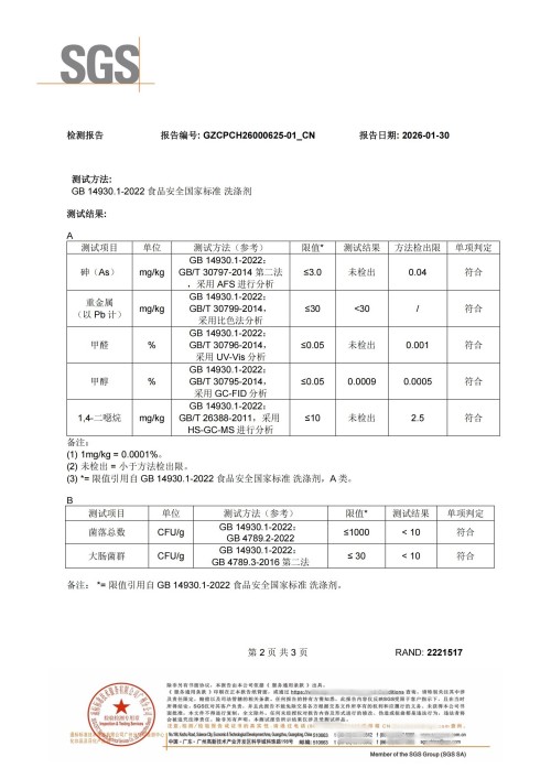 当安全标准提升至可接触食品的A类等级,意味着所有注重健康品质的家庭人群对产品品质的可靠性产生更高的期待。为进一步验证立白智净洗碗机专用天然洗碗粉的 A 类安全属性与全食品用成分优势,品牌特别委托国际权威检测机构 SGS 开展专项检测,重点针对食品安全国家 A 类标准核心管控物质进行全面筛查。检测项目严格覆盖砷、铅等重金属,甲醇、甲醛、1,4 - 二噁烷等有害化学残留,以及菌落总数、大肠菌群等微生物指标,所有检测均依据《食品安全国家标准洗涤剂》等权威标准执行,检测结果均符合 A 类食品标准严苛要求。这份 SGS 检测报告从原料安全性、成分纯净度、使用无残留等多维度,实证立白智净天然洗碗粉 “全食品用成分、0 添加有害化学物质、无残留” 的核心优势,让产品通过 A 类标准认证的结论更具说服力,为家庭餐具清洁安全再添一道坚实保障。