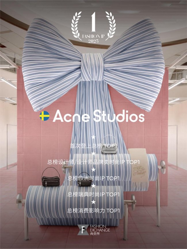 2025年,瑞典设计师品牌Acne Studios位列总榜第一,也是首个问鼎榜首的瑞典品牌。其排名跃迁轨迹具有典型意义:自2021年首次上榜(第84位)以来,连续四年稳步攀升,于2025年成功登顶,它的登顶并非偶然,而是一次长期坚守其独特的“品牌文化美学”的胜利。自2023年起,Acne Studios在中国市场的消费影响力开始明显加速,至2025年成为总榜消费影响力最高的时尚IP。与此相呼应的是,为庆祝旗下刊物《Acne Paper》出版20周年,Acne Studios在巴黎、米兰、纽约与上海等全球核心文化与时尚城市同步启动流主题发布及快闪活动,进一步强化了其以出版与艺术为核心的品牌文化体系。