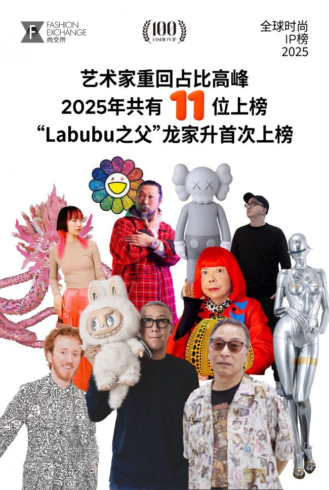 与此同时,艺术家类时尚IP占比回升至11位,达到近年高点。中国艺术家龙家升(“Labubu之父”)首次上榜,英国艺术家Mr Doodle成为榜单发布7年来首个上榜的欧洲艺术家。这背后反映出“情绪价值”与“艺术疗愈”正在成为新的消费驱动力。同时,NIGO与藤原浩连续7年上榜,说明长期文化影响力仍然具有稳定价值。