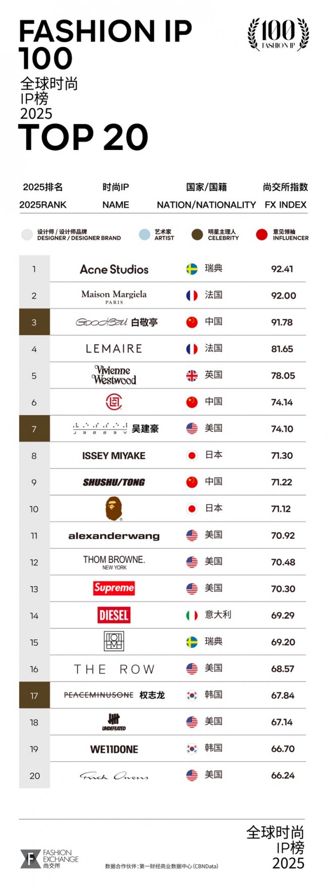 2025年《全球时尚IP榜》 FASHION IP 100基于尚交所指数(FX INDEX)数据评估体系,从「CBNData消费大数据」、「微信、小红书、百度搜索引擎热度」、「小红书、抖音、微博社交媒体人气」三个维度提取大数据(统计时间:MAT2025年),对全球范围内超过400个时尚IP进行量化评估,评选出了2025年度在中国市场上兼具商业价值与品牌影响力的TOP100时尚IP。自2019年起,尚交所发起的针对时尚IP综合价值的量化评估体系——尚交所指数(FX Index)及全球时尚IP榜《FASHION IP 100》,已经被全球媒体和时尚IP、品牌们广泛引用和参考。