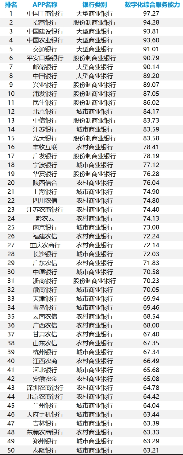 表 2025年手机银行数字化综合服务能力TOP50