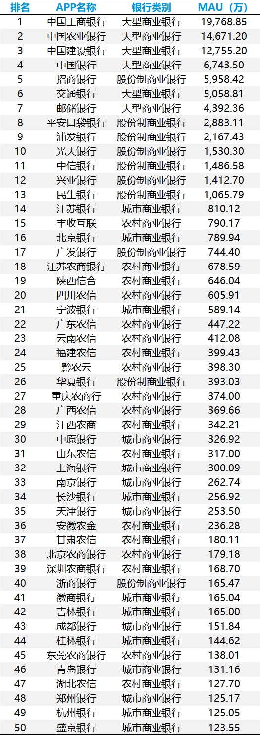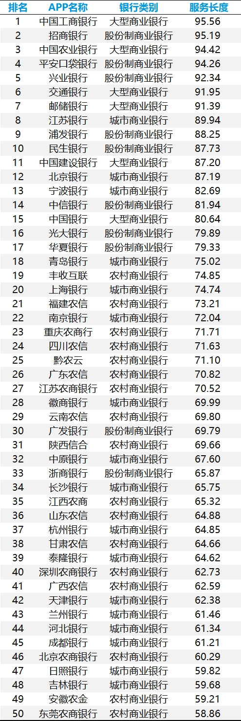 表 2025年手机银行数字化服务长度TOP50