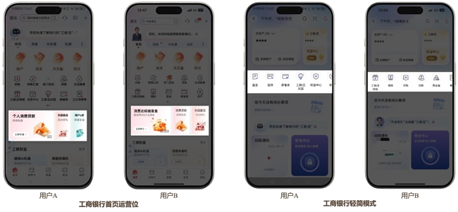 工商银行优化智能推荐服务,提升推荐的精准程度,广泛吸引个性化需求不同的客群。一是在将首页核心运营位优化为可放大的滑动式卡片,选中时展示卡片全景,收起时精简信息,最大程度利用屏效,配合功能精选和推荐服务,实现全量覆盖、精准触达。二是在“轻·简”模式中个性化地推荐功能和服务,优化布局和触达效率,打造最佳通道效应。