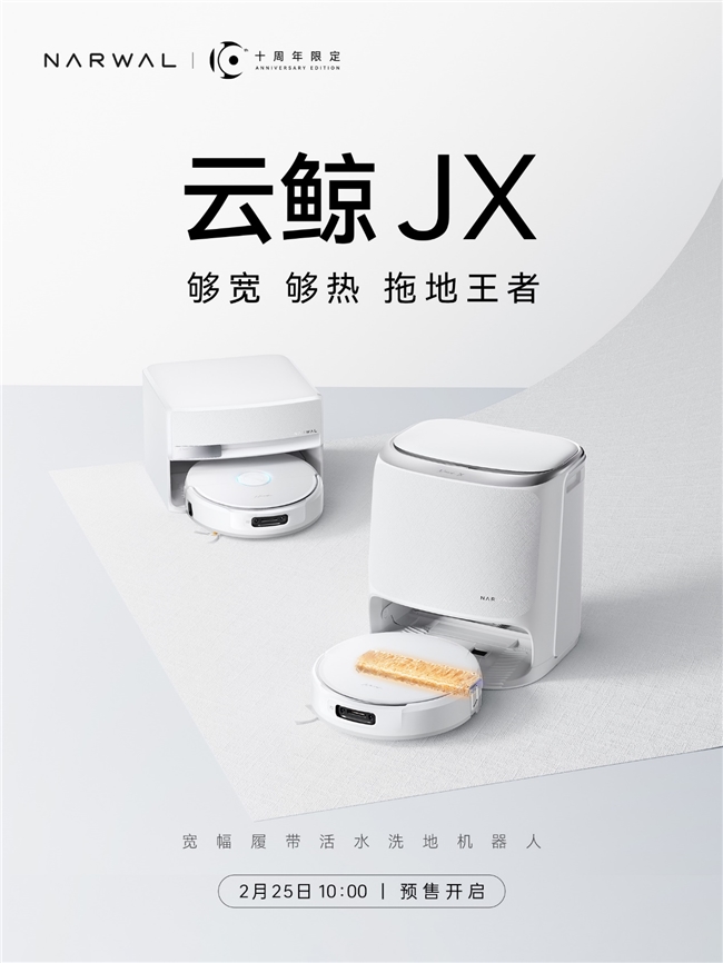 2月25日,云鲸智能正式发布十周年巅峰之作——云鲸宽幅履带活水洗地机器人JX系列,其中水箱版售价4199元,超薄基站上下水版售价4599元,于今日上午10:00起在京东、淘宝、抖音等电商平台同步开启预售。