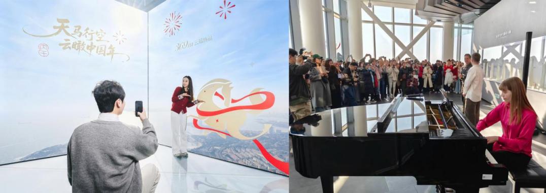云上海天持续打造“云瞰中国年”主题活动,成为新春文旅的热门打卡地。369 米的高空祈福区,游客们凭栏远眺青岛的山海美景,许下“天马行空”的新年祝福,成为一道独特的风景。“在云端祈福,俯瞰整个青岛的红瓦绿树、碧海蓝天,这种体验太独特了,云上海天的活动把‘吃喝游购娱’都整合了,一站式体验特别方便!”来自浙江的游客陈先生打卡完云上海天,忍不住竖起大拇指。这里不仅有高空祈福、NFC 寻宝、主题演绎等趣味内容,杜大恺艺术展更让游客感受艺术之美,82F云璟餐吧的春节新餐品鉴、文创酒品鉴等,更让味蕾与视觉双重满足。生肖马免费入馆、亲子联票、“票+讲解+茶饮”复合型票种的推出,既让更多游客走进云上海天,也提升了消费体验,实现了“客流”与“客留”的双重提升。