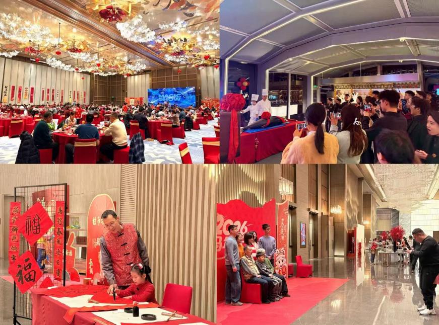 海天大酒店作为青岛的“城市封面”,成为岛城高端文旅消费的核心支点。酒店以“来海天过大年”为核心打造沉浸式团圆场景,大宴会厅里三百余位宾客齐聚,写福字、拍全家福、看非遗表演,财神送福的喜庆氛围拉满。“从济南来青岛过年,没想到在酒店能感受到这么浓的年味,还体验了“风生水起捞鱼生”仪式,拍了全家福,仪式感直接拉满!”来自济南的游客王女士和家人一起参与完宴海阁中餐厅的互动,笑着说道。1988全日餐厅分时段打造民俗体验,糖画、捏面人唤醒童年记忆,乐队演出与财神送福让晚餐时段的视听与味觉双重升级。在三沙日餐厅与海天壹号餐厅的除夕自助,200斤金枪鱼现场开鱼秀,让海鲜美味与新春热闹完美交融。和家人在海天过年的市民常先生感叹:“出来过年氛围非常好,家人非常高兴,酒店服务非常好,出来过年更加省心。”