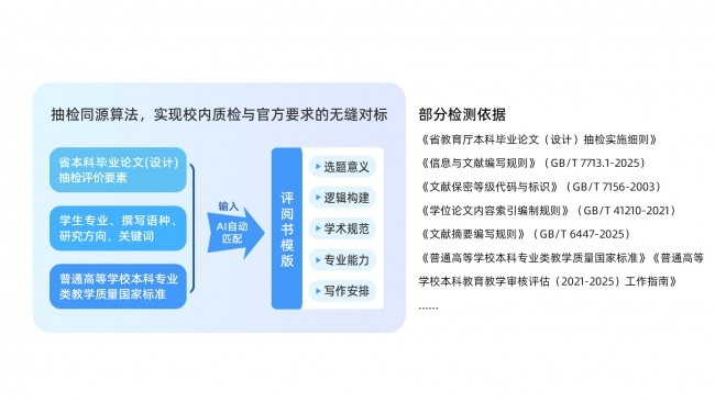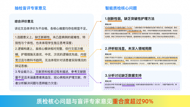尤为值得一提的是,该系统支持在抽检前开展“预盲审”模拟,提前暴露论文风险。在实际应用中,其智能质检报告指出的核心问题与省级抽检专家意见重合度超过90%,有效协助高校实现“早发现、早整改”,大幅降低事后风险。