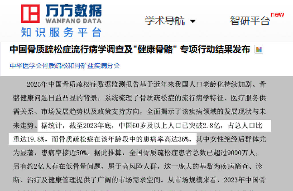 全国骨质疏松症流行病学调查显示,我国60岁以上人群骨质疏松症患病率高达36%