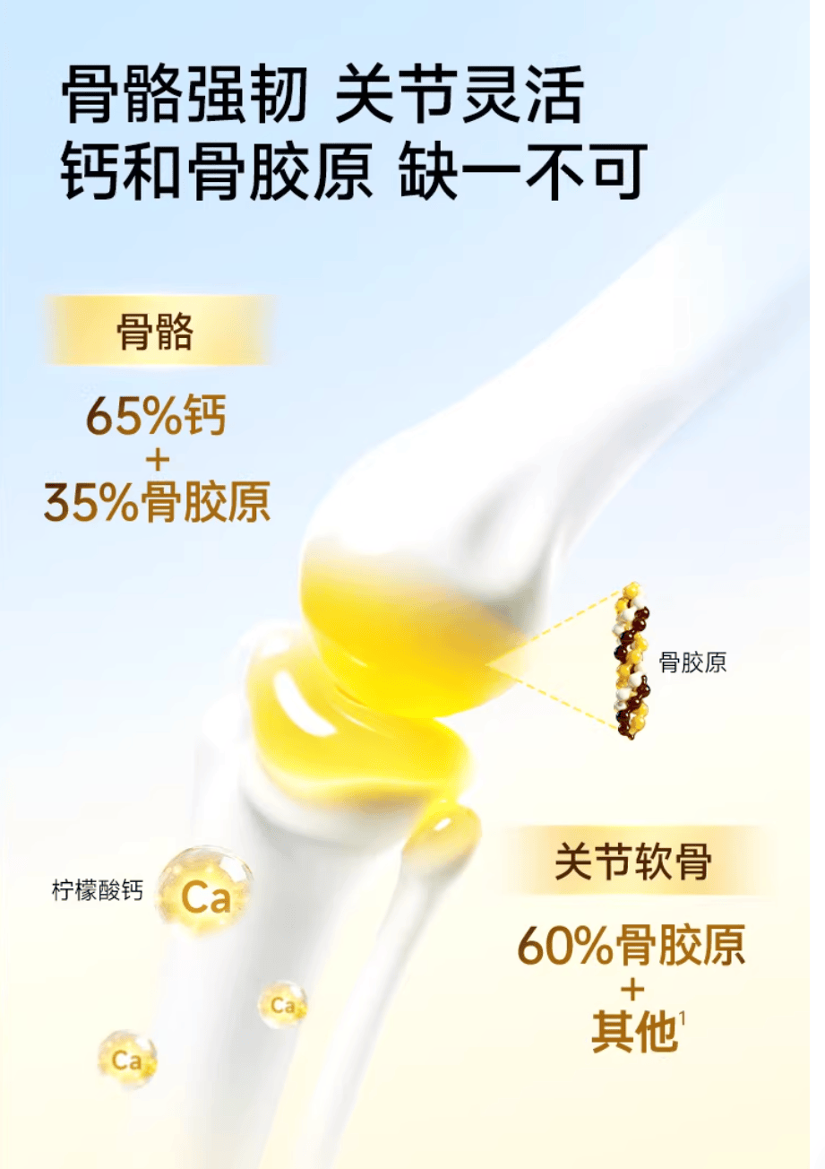 因此,若单纯补钙或依赖氨糖,都只能解决骨骼关节的局部问题——前者补充硬度却忽略结构,后者润滑表面却未加固承重结构。这正是许多中老年人长期补充却收效甚微的根本原因:骨骼的强韧与关节的灵活,归根结底离不开骨胶原钙这张“生命网”。
