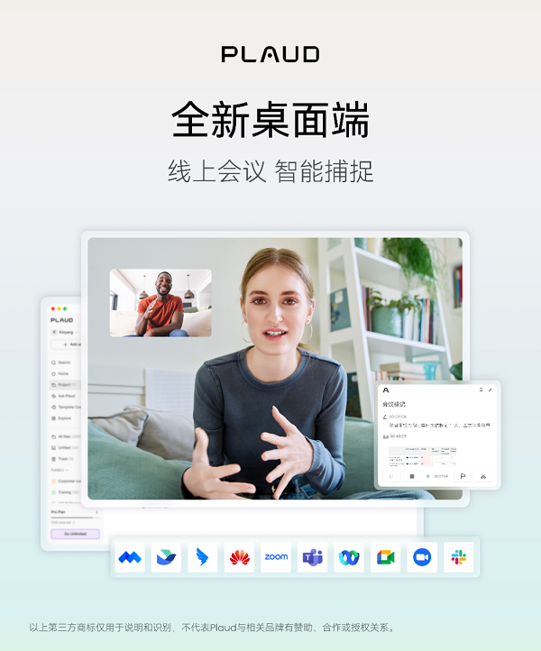 此外,Plaud桌面端能够自动识别飞书会议、腾讯会议、钉钉会议、华为云会议、Zoom、Google Meet等主流线上会议,摆脱了单一会议软件的限制,让用户更专注于对话本身,节省时间用于洞察、思考以及创造更多价值。