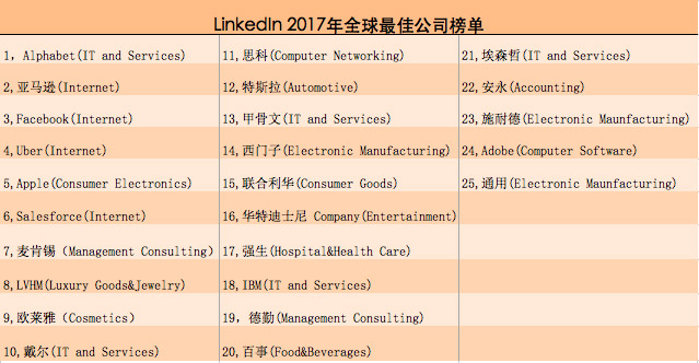 近期职业社交平台LinkedIn发布了2017年全球最佳公司排榜(2017 Top Companies Global),以往福布斯、CNNMoney发布的最佳雇主企业总有几个面孔不那么脍炙人口,但这次领英的榜单上都是广为人知的公司。