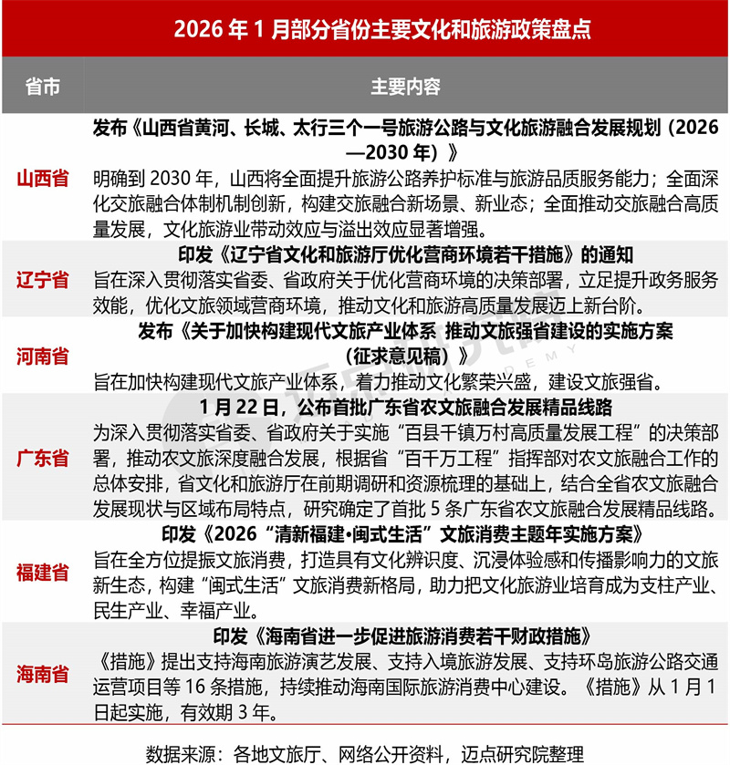 2026年1月,多个省份围绕文化和旅游高质量发展相继出台重要政策,呈现出因地制宜、重点突出的特征:山西省着眼于交旅深度融合,围绕黄河、长城、太行旅游公路布局,推动交通与文旅场景创新;辽宁省聚焦优化营商环境,着力提升文旅领域政务服务效能;河南省明确以构建现代文旅产业体系为目标,加快推进文旅强省建设;广东省结合“百县千镇万村高质量发展工程”,推出首批农文旅融合精品线路,促进乡村文旅发展;福建省以“闽式生活”为主题,着力提振文旅消费、打造特色文旅生态;海南省则通过财政奖励措施支持旅游演艺、入境旅游等重点领域,持续建设国际旅游消费中心。整体来看,各省结合自身文旅发展实际与重点、精准发力,以特色化路径与系统化举措构筑文旅高质量发展新格局。