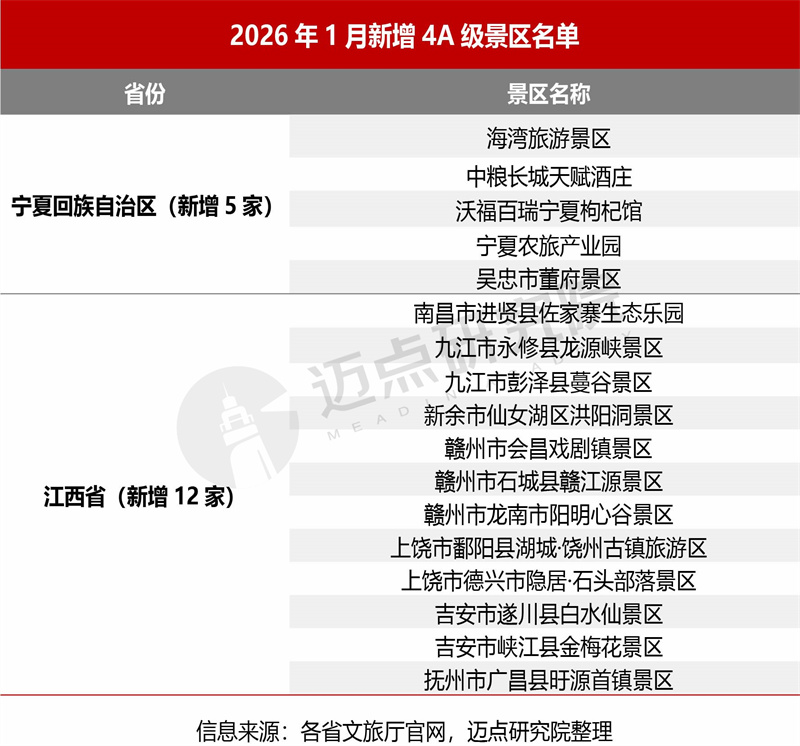 1月,宁夏自治区新增5家4A级景区,突出产业融合,涵盖酒庄、枸杞馆等特色主题;江西省新增12家4A级景区,兼具自然生态与人文底蕴,且分布广泛(南昌、九江、新余等7市),进一步丰富了全省优质文旅产品供给。如以会昌戏剧镇景区为例,2026年春节假期,戏剧小镇以“隆咚隆咚锵·一起闹马年”为主题,推出新春系列文旅活动,吸引游客赏非遗、玩游戏、品年味。