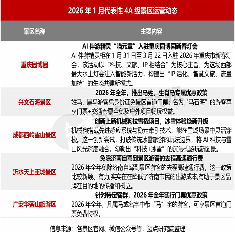 1月代表性4A级景区运营主要呈现如下趋势:一是科技赋能体验,重庆园博园引入AI伴游精灵打造智慧文旅新生态、成都西岭雪山运用机械狗等先进装备勾勒“科技+冰雪”体验场景;二是精准客群运营,宜宾兴文石海、广安华蓥山等景区结合生肖马年元素推出专属优惠,以细分客群策略激活消费潜力;三是以交通补贴政策吸引重点客源市场,沂水天上王城通过免除济南自驾到景区游客的去程高速通行费,加速开发济南客源市场。未来景区应聚焦技术驱动重塑场景体验,并通过精准化、情感化营销强化景区品牌粘性,实现高质量发展。