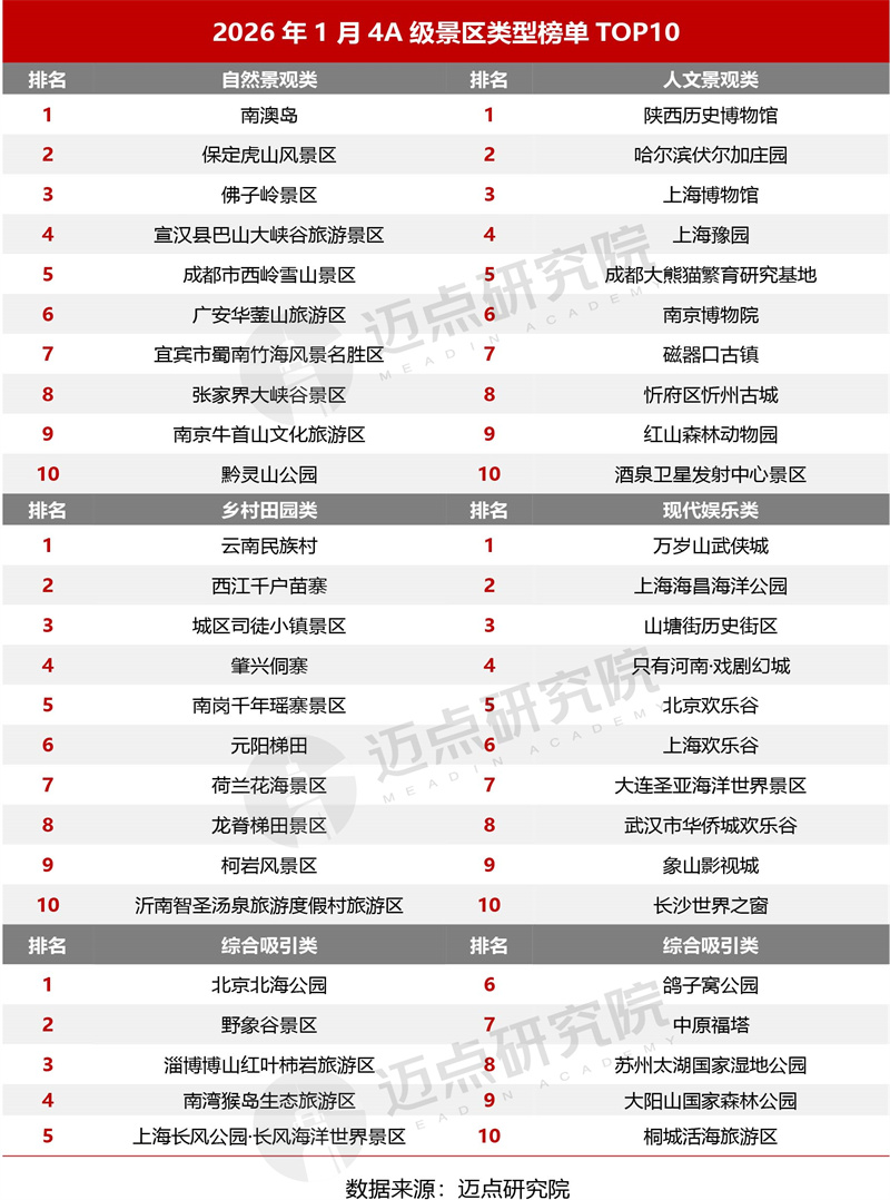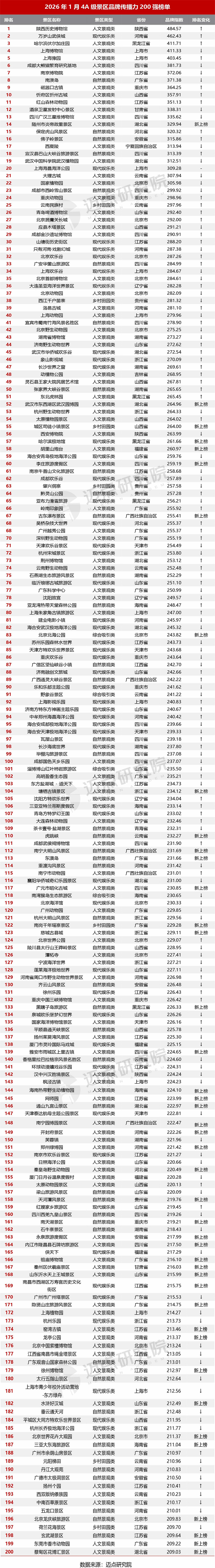 以下是迈点研究院独家发布的“2026年1月4A级景区品牌传播力200强榜单”。本月,陕西历史博物馆、万岁山武侠城、哈尔滨伏尔加庄园、上海博物馆、上海豫园、成都大熊猫繁育研究基地、南京博物院、南澳岛、磁器口古镇、忻府区忻州古城进入榜单前十。200强榜单中,共有65个品牌排名环比上升,91个品牌排名环比下降,1个品牌排名保持不变,43个新上入榜品牌。