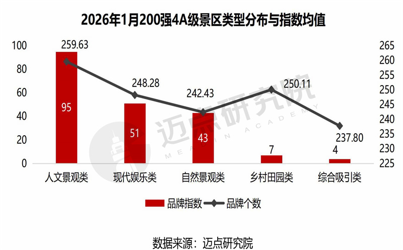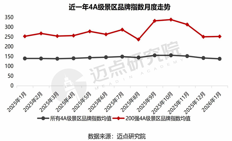 1月,所有4A级景区品牌指数为137.96,环比下降2.92%,同比下降1.25%;其中200强4A级景区品牌指数为252.27,环比增长0.64%,同比下降0.37%。比较而言,头部4A景区的市场韧性与抗波动能力明显更强,同时,行业分化格局持续加深。