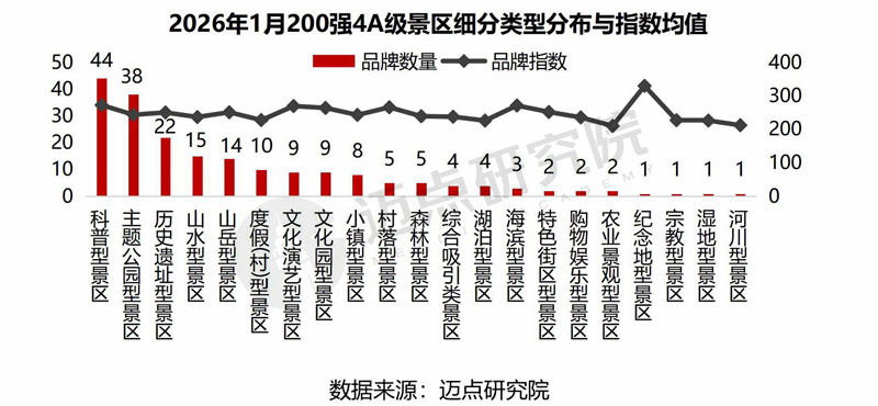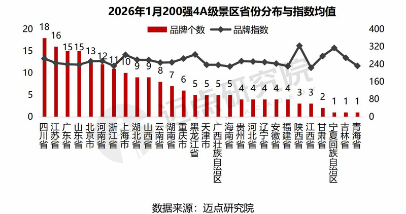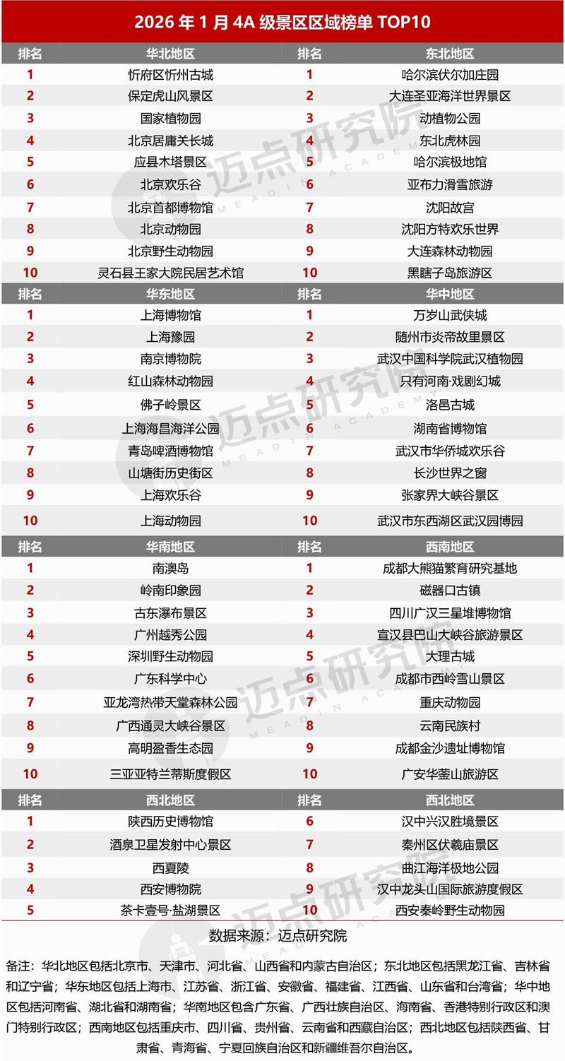 “2026年1月4A级景区品牌传播力200强榜单”数据来源于迈点品牌指数MBI,根据迈点品牌指数MBI的4318家景区数据汇总统计而成。具体说明如下: