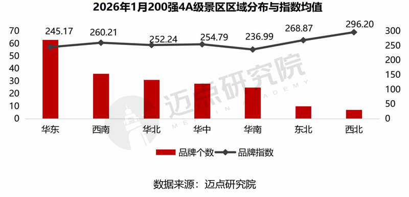 品牌指数层面,西北地区296.2引领各区域,系陕西历史博物馆景区(榜首)的强势带动;东北地区品牌指数268.87,位列第二,融合冰雪运动、俄式异域风情、极地海洋、现代主题游乐等丰富业态,品牌影响力提升;华南地区品牌指数236.99,在七大区域中排名靠后,主要因100名之后的景区占17家、新上榜10家,拉低整体均值。