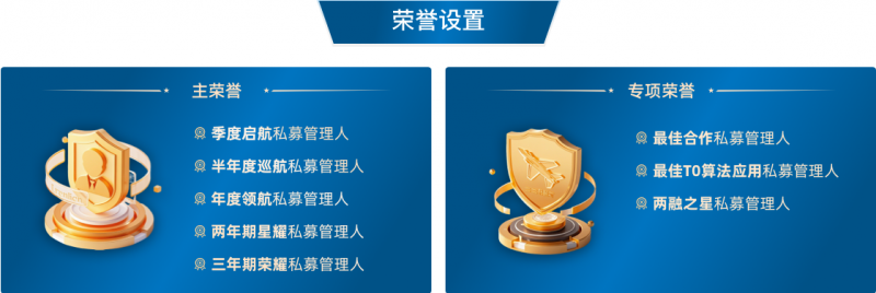 本次活动设立层次分明、周期完整的荣誉体系,包括主荣誉与专项荣誉两大类。主荣誉涵盖“季度启航私募管理人”“半年度巡航私募管理人”“年度领航私募管理人”“两年期星耀私募管理人”及“三年期荣耀私募管理人”,每项荣誉均在五大策略组别、两大规模分组中各评选出5家机构,评选维度包括产品相关情况、团队背景、行业口碑、投研体系等。