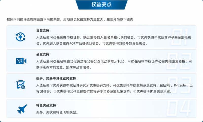 以年度及以上荣誉获得者为例,可优先获得中航证券及联合主办单位的代销机会、种子基金跟投(仅限中航组)、FOF产品备选池准入、外部资金对接等核心权益,同时有机会优先纳入中航证券、中航期货、私募排排网等多平台白名单;品宣方面可获得中航证券内部路演、私募排排网线上路演及排排网集团软文宣传等支持;投研与交易方面涵盖中航证券研究所优惠投研服务、专业化交易系统支持,以及投研平台、运营系统的免费试用等;还可获得奖杯、奖状及中航证券特色飞机模型等荣誉奖励。