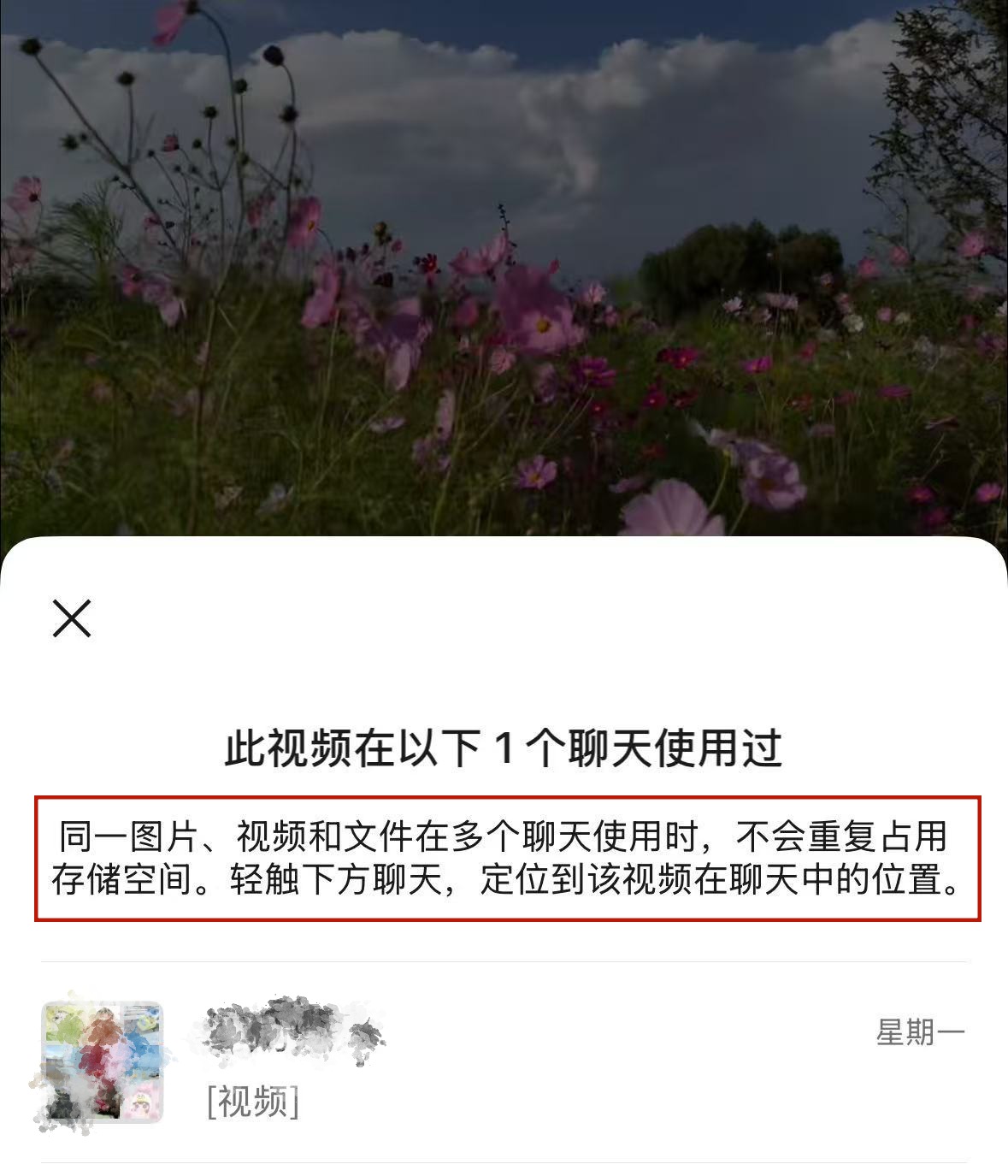 在结果显示页面,微信特别标注“同一图片、视频和文件在多个聊天使用时,不会重复占用存储空间”。轻触下方聊天,则可定位到该图片、视频和文件在聊天中的位置。
