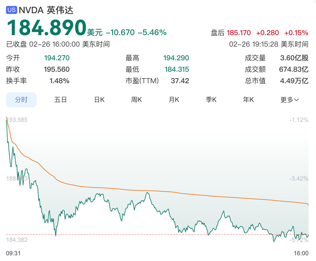 当地时间2月26日,美股三大指数收盘涨跌不一,大型科技股多数下跌,英伟达(NVDA)股价大幅跳水,单日跌幅超5%,市值一夜之间蒸发超2700亿美元(约合人民币1.77万亿元),创下自去年4月16日以来近11个月的最大单日跌幅。截至当日收盘,英伟达股价报184.89美元,较前一交易日下跌10.67美元,跌幅达5.46%,换手率1.54%,成交量达3.6亿股,成交额675亿美元,创下近期单日成交量新高,总市值降至4.49万亿美元。