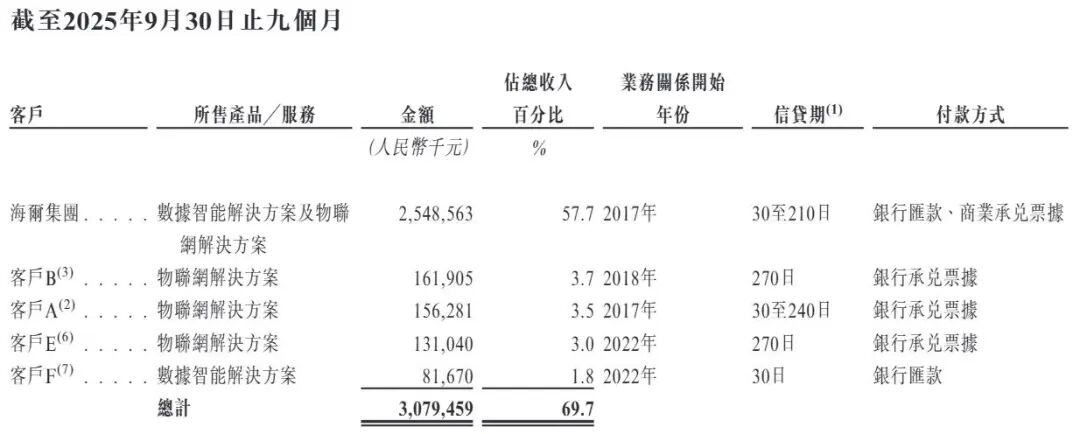 事实上,不只是控股股东,《招股书》显示,卡奥斯2023年、2024年及2025年前9个月的第一大客户均为海尔集团,各期分别实现收入36.07亿元、34.21亿元和25.49亿元,分别占总收入的72.2%、67.5%和57.7%。