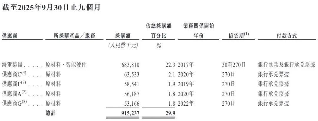 《招股书》显示,海尔集团主要向卡奥斯提供物联网和数据智能解决方案所需的原材料,包括电子元件、硬件、软件及系统整合元件等,卡奥斯各期分别向海尔集团采购8.55亿元、8.63亿元和6.84亿元,分别占各期采购总额的21.7%、22.3%和22.3%。