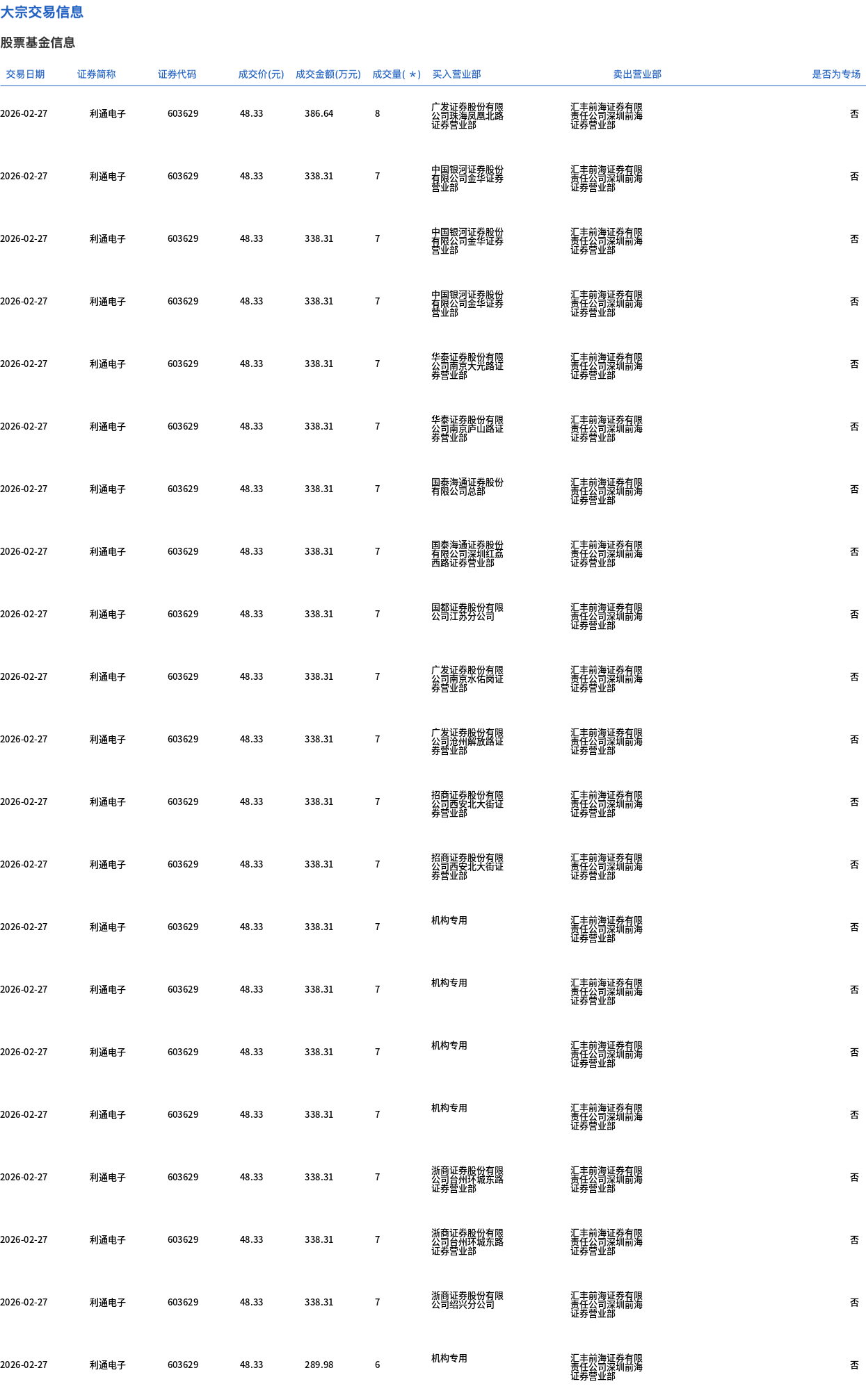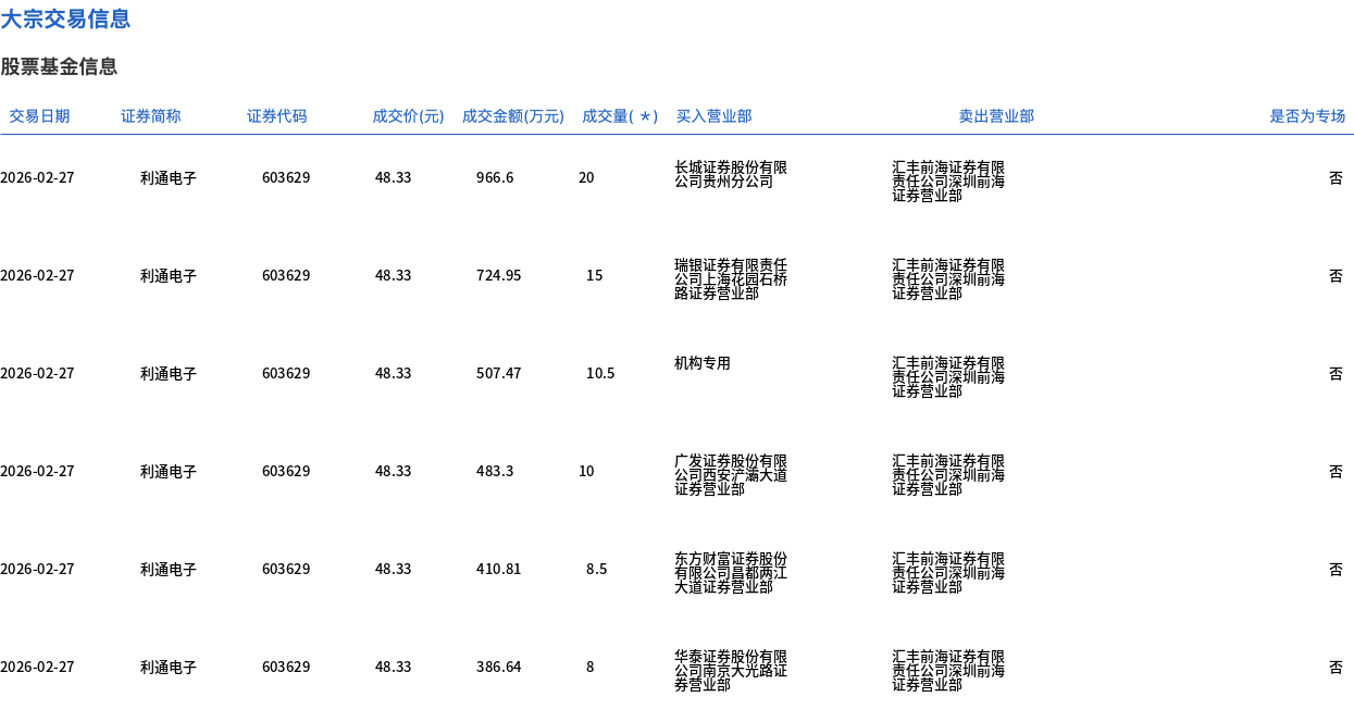 2月27日,利通电子大宗交易成交219万股,成交额1.06亿元,占当日总成交额的4.62%,成交价48.33元,较市场收盘价58.52元折价17.41%。