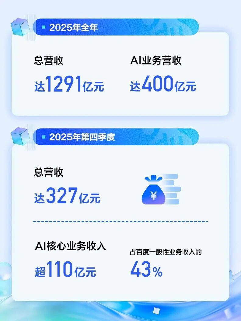 体现在数据中,2025年,百度总营收达1291亿元,其中AI业务营收达400亿元;四季度,百度总营收327亿元,AI业务收入占百度一般性业务收入的43%,超出市场预期。