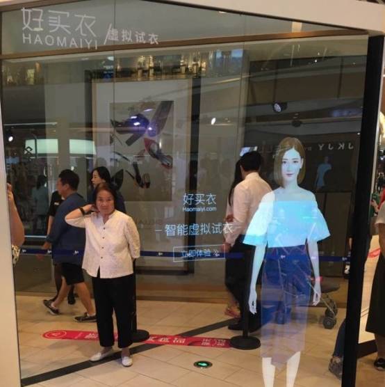 这款虚拟试衣镜,用户走到镜子前被扫描识别后,镜子内会直接变幻出另一个虚拟用户,通过对脸型、身高、体重、发型、肤色甚至身材细节的调整,这个虚拟用户会无限贴近用户本人,点击就可快速试“穿”各种陈列在虚拟货架上的服装。