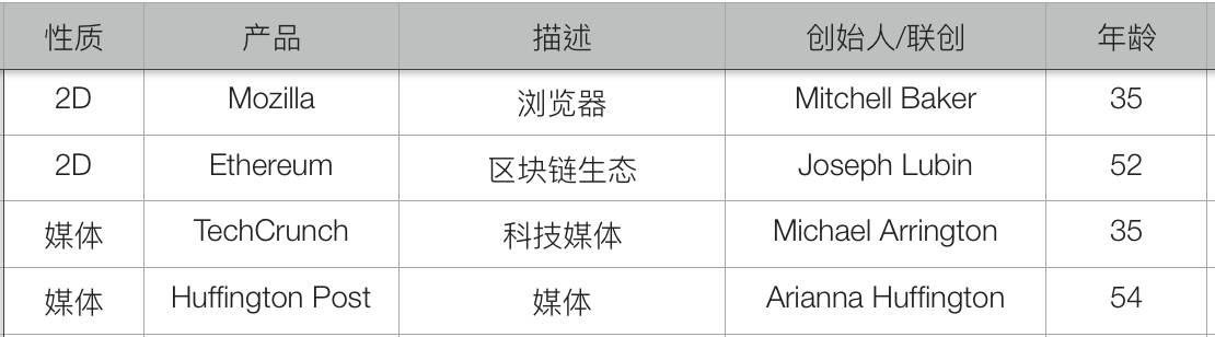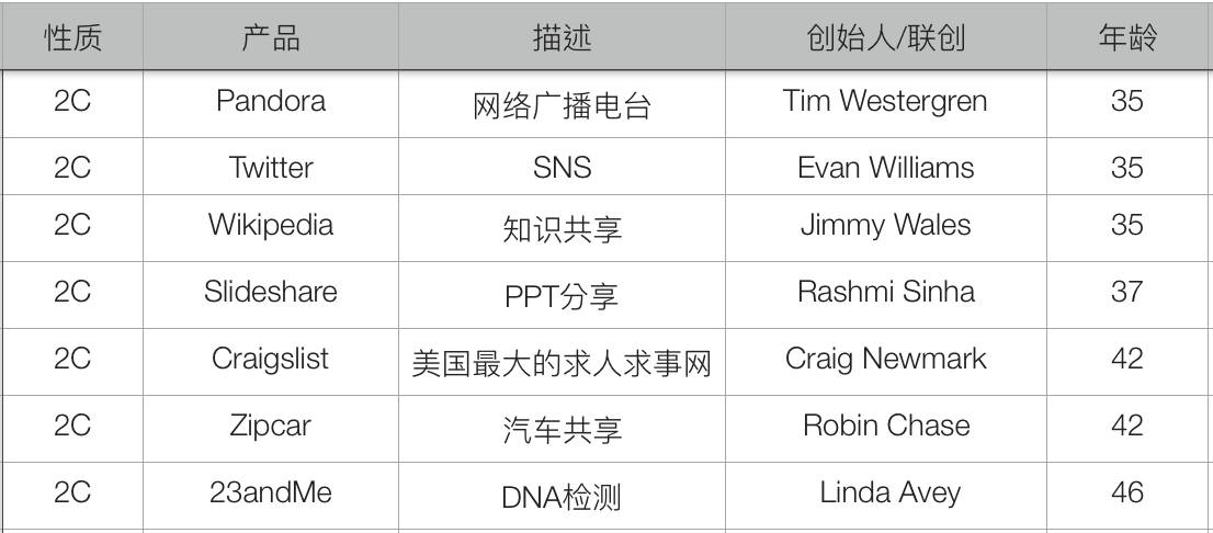 “闯劲”一词的确不适用于要即将踏入40岁的70后,或是已过35岁的80后。现在被华尔街称为“FAANG”的科技大亨:Google、Facebook、Apple、Amazon、Netflix。除了亚马逊的Jeff Bezos在30岁创业,Netflix的Reed Hastings在35岁创业之外,都是20出头就创立的公司。包含独角兽的Airbnb、Snap、Dropbox、Uber、Lyft也都如此。但也有许多例外,以下是我整理出来的几个案例: