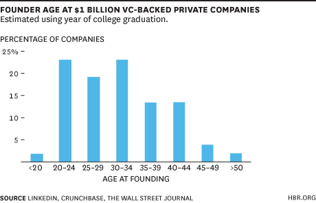 虽然我指出了些35岁之后才开始创业的创始人,但当我们来分析独角兽公司创始人开始创业时的年龄,你可以发现年轻人还是占多数的。以下资料参照哈佛商业评论: