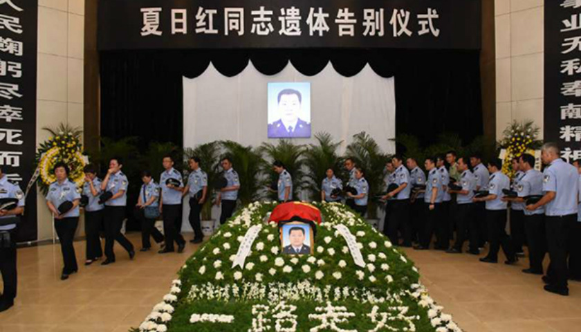 18日,因公牺牲的郑州荥阳市公安局局长夏日红遗体告别仪式在荥阳市青龙岗殡仪馆内举行。当天有河南省公安副厅长、郑州市副市长、市公安局局长沈庆怀等领导和郑州市公安局各单位民警代表,以及夏日红的亲属和生前好友1000余人,参加了遗体告别仪式。