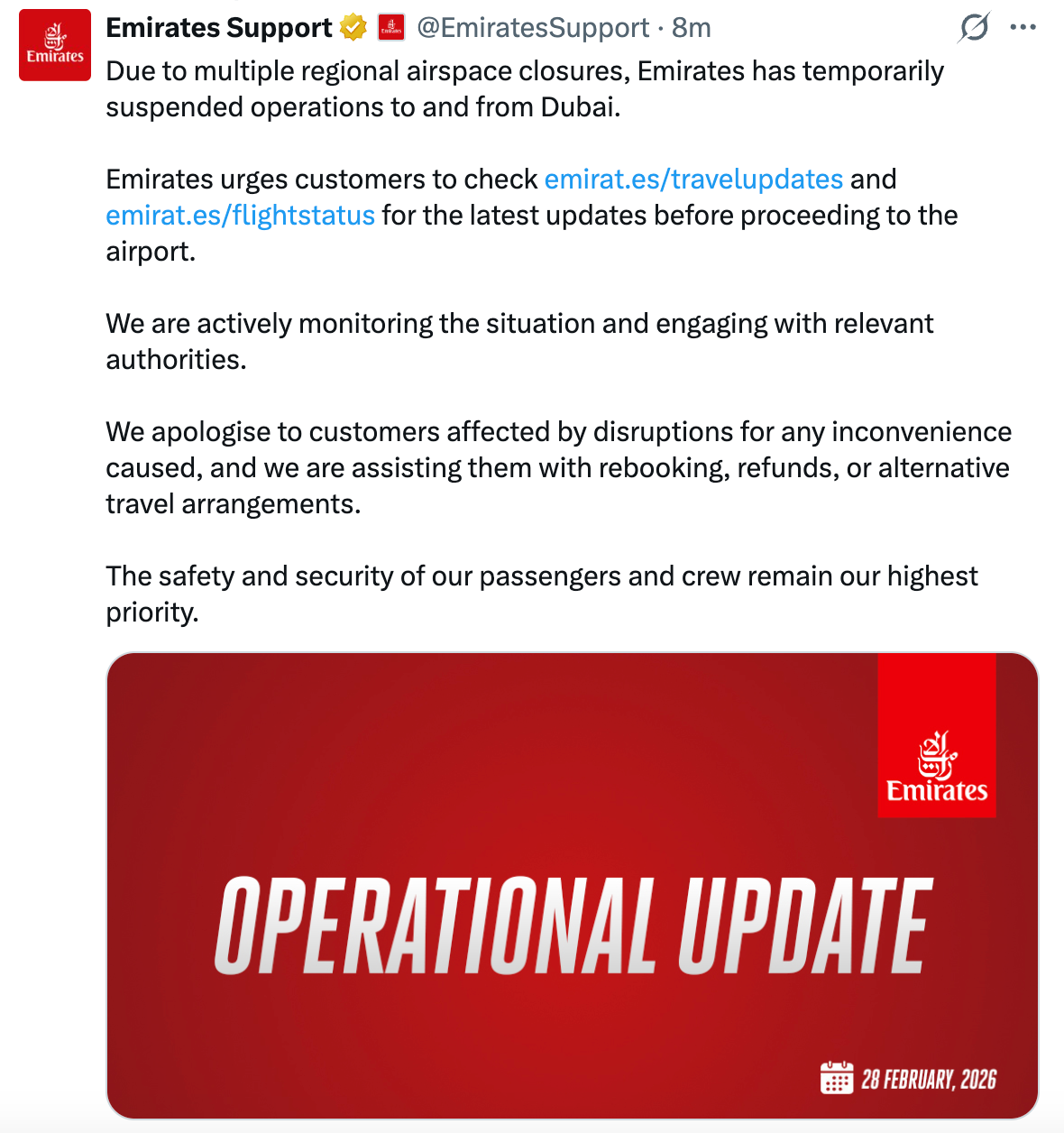 “我们正密切关注事态发展并与相关机构保持沟通。对于受航班中断影响的旅客,我们深表歉意,并将协助办理改签、退款或替代出行方案。”阿联酋航空称。