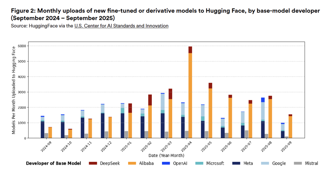 斯坦福大学“以人为本”人工智能研究院的一份报告显示,2025年9月,阿里巴巴的Qwen模型家族超越Llama,成为Hugging Face上下载量最高的LLM模型家族。2024年8月至2025年8月期间,中国开放模型开发者占Hugging Face总下载量的17.1%,略高于美国开发者的15.8%。与此同时,自2025年1月以来,基于阿里巴巴和DeepSeek发布的开放模型的衍生模型上传量超过了基于美国和欧洲主流模型的衍生模型。